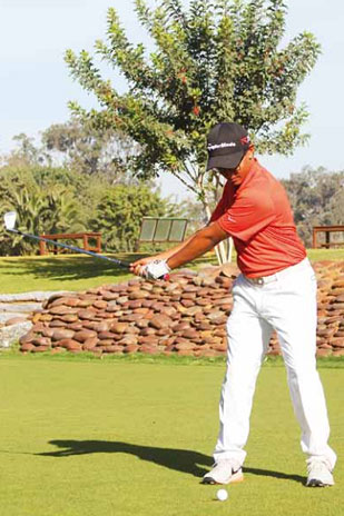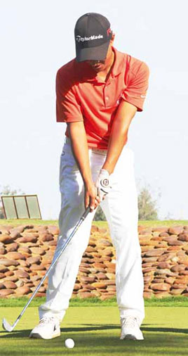 d’impact, L’action des mains et des poignets sera minimisée par un démarrage en rotation du corps et des hanches. La traversée est plus horizontale afin d’être moins agressif sur la bal le et de moins forcer son contact (divot très fin).