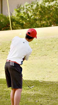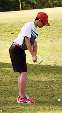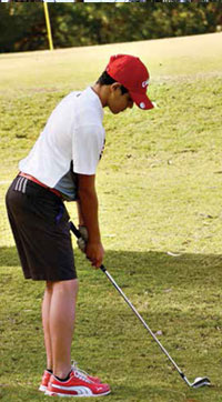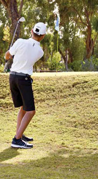 Situation : la balle est dans une pente descendante vers le green, entre 20-25 mètres du drapeau. La balle est dans un léger rough, le lie est correct. Le club à jouer est un sandwedge ouvert à 58°.