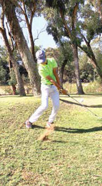 La descente se fait d’un bloc en rotation avec les épaules. La tête de club longe le sol bien après l’impact, le poids est toujours sur le pied avant. Il n’y a aucune action des mains.